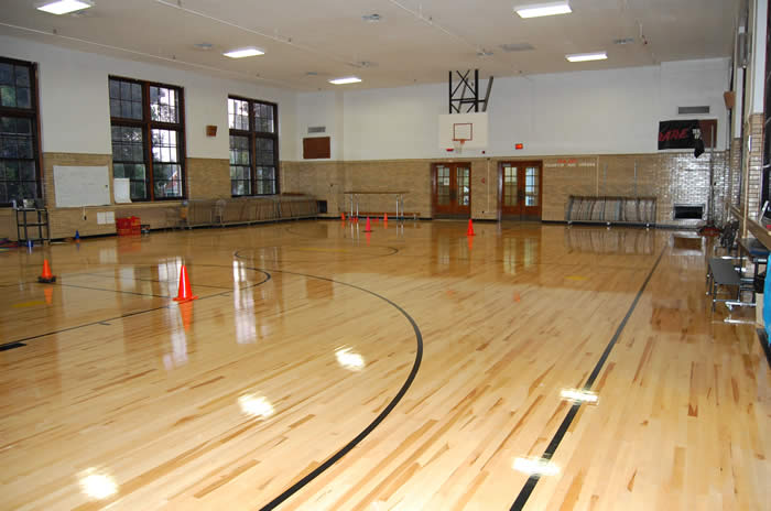 The gymnasium floor is constructed with durable yet affordable vinyl tile. A painted stripe helps de-emphasize the gym's high ceiling. The basketball goals are retractable allowing for multi-purpose use.